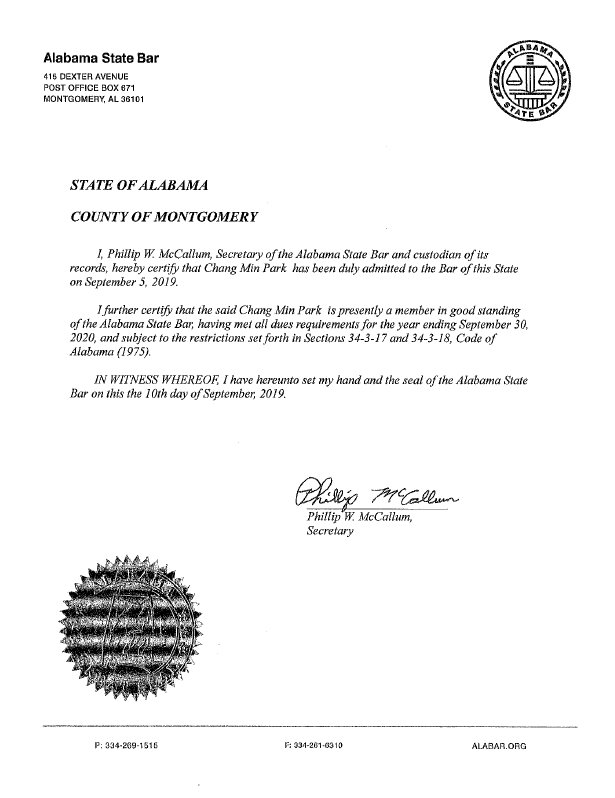 그리고, 2019년 9월 5일, 알라바마 주 변호사 협회에 공식 미국 변호사로 등록되었습니다.