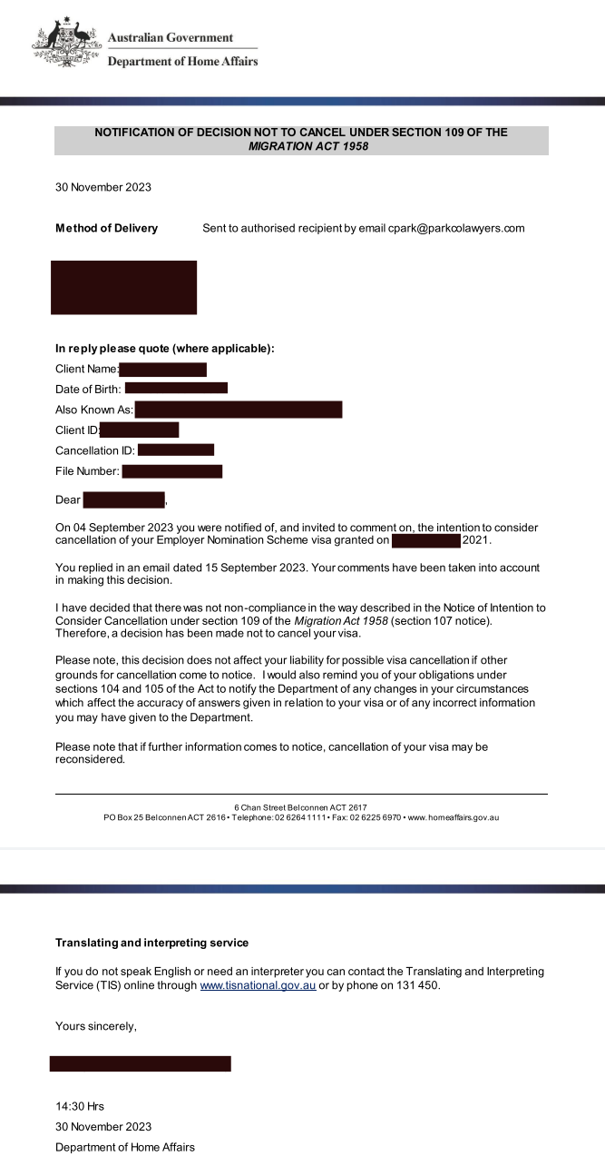 비자응급실 사건은 일단 투입되면, 가장 최우선 순위 작업이 이루어지므로, 9월 15일에 변론서를 제출하고, 오늘 11월 30일에 이민성에서 Notice of decision not to cancel 이라는 비자취소가 이루어지지 않을 것임에 대한 최종 결정이 확정된 비자취소 변론 성공 사례입니다.
