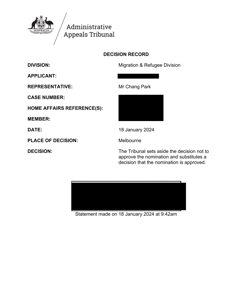2023년 12월 13일, 캔버라에서 펼쳐진 비디오 히어링. 재심위원은 Melbourne 에 위치하고 있었고, 아래 사건은 2020년 거절된 TSS nomination 및 비자 거절 사건이었으나, 2023년 2월에 대리인 교체를 통해, 내가 사건을 진행한 사건이다.
