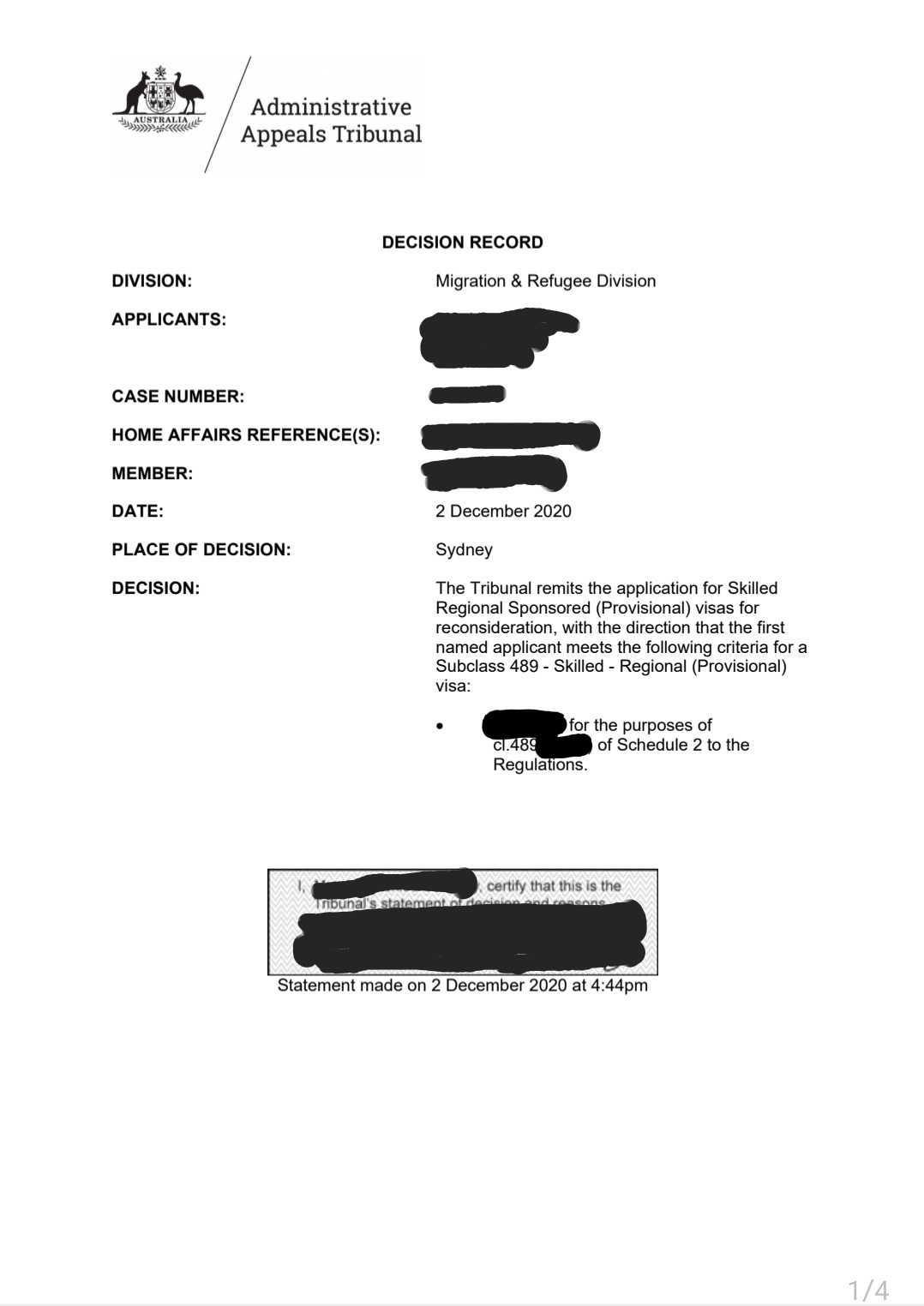 아래 사건은 489 비자 진행 과정에서 의뢰인 본인 사정으로 최초 비자가 거절되었던 사건을 AAT 로 진행해서 (그것도 내가 직접 이 사건은 반드시 AAT 로 진행해야한다고 졸라서!) 서면 변론서와 추가증거를 통해 AAT 에서 이를 받아들여, hearing (심리 - 라고쓰고, 약식재판 / 조정 정도로 이해하는 것이 마땅하다) 없이 재심에 성공한 예제이다.